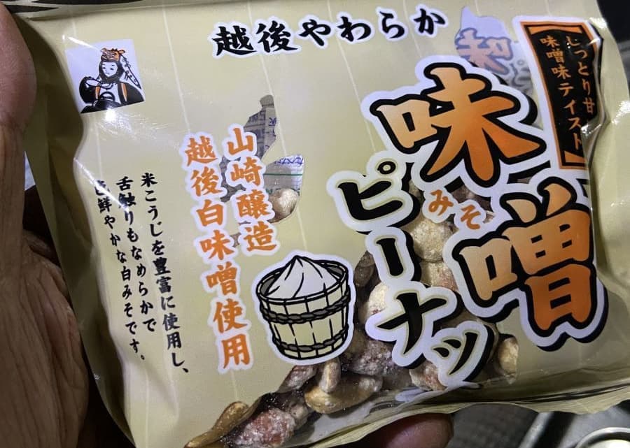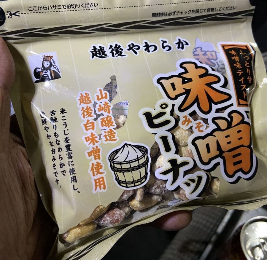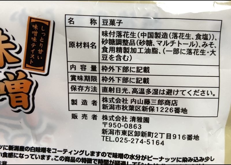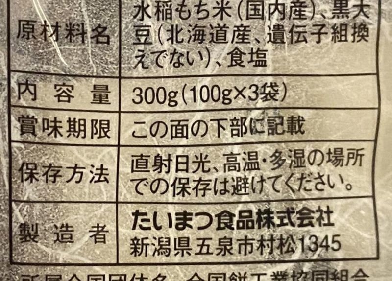 「中尾中山間地豆菓子」(製造は新潟県小千谷の竹島屋製菓さん)で信州七二会産の黒大豆を直火で煎って赤穂の天塩で味付けしているとあります。